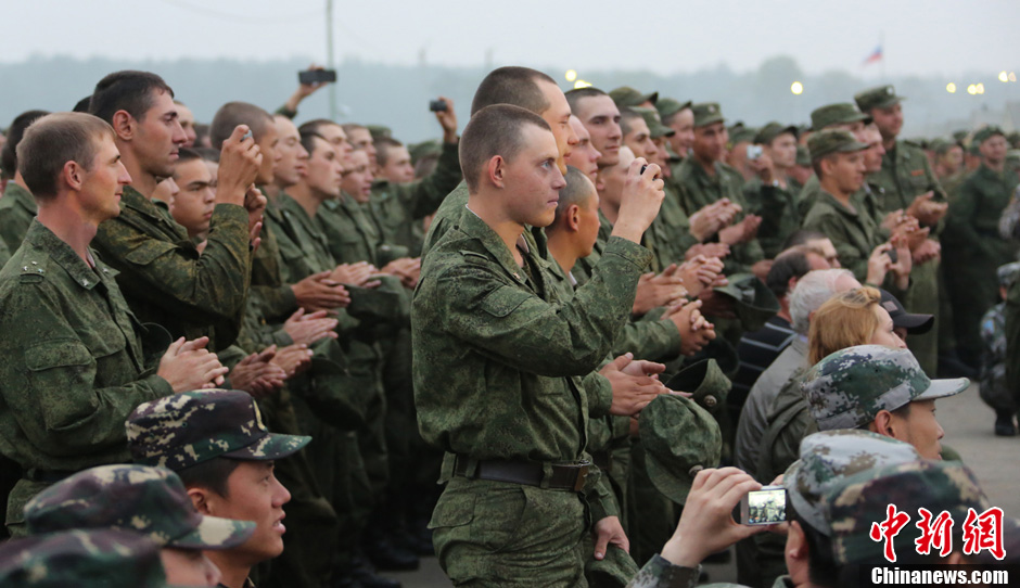 8月10日,隨同中方參演部隊(duì)赴俄羅斯參加“和平使命-2013”中俄聯(lián)演的沈陽(yáng)軍區(qū)政治部文工團(tuán)演員們,為中俄千余名參演官兵獻(xiàn)上了一場(chǎng)精彩的文藝晚會(huì)。豐富多彩的文藝節(jié)目,將位于切巴爾庫(kù)爾訓(xùn)練場(chǎng)的中俄聯(lián)演野營(yíng)村,變成了友誼的盛會(huì)、歡樂的海洋。圖為精彩節(jié)目吸引俄國(guó)官兵。中新社發(fā) 李祥輝 攝
