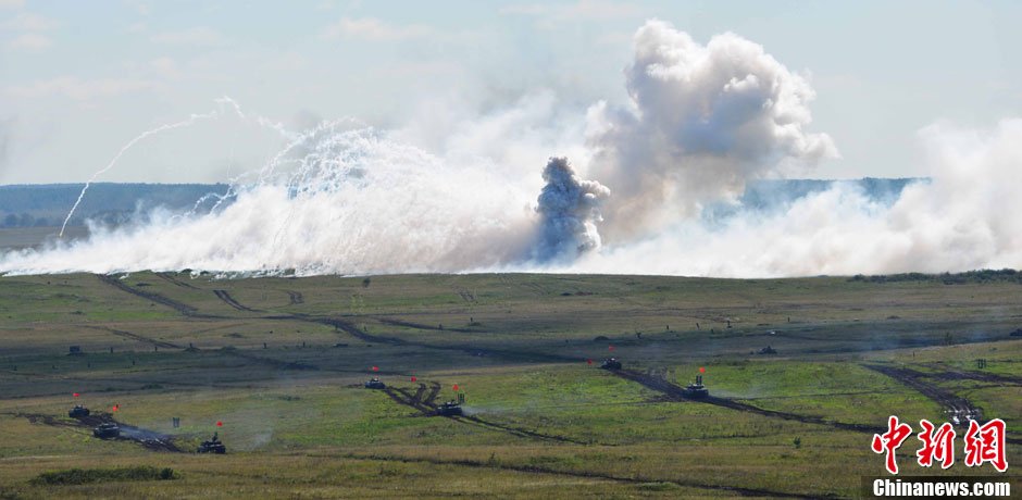 8月12日12時(北京時間下午2時),“和平使命-2013”中俄聯(lián)合反恐軍事演習(xí),在俄羅斯切巴爾庫爾合同訓(xùn)練場進(jìn)行了實(shí)兵實(shí)彈協(xié)同訓(xùn)練。圖為中方裝甲車成攻擊隊形向敵縱深發(fā)展攻擊。中新社發(fā) 譚長俊 攝