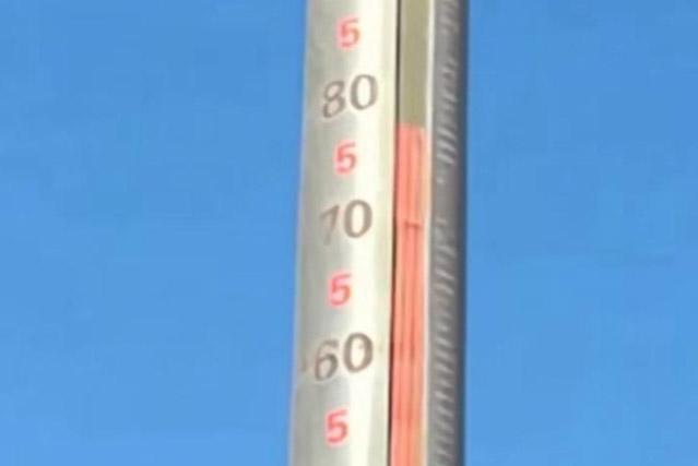 6月13日,吐魯番市火焰山景區(qū)內(nèi)巨型“金箍棒”電子溫度計顯示溫度高達(dá)80攝氏度,吸引游客們爭相上前與之合影。陳學(xué)敏 攝
