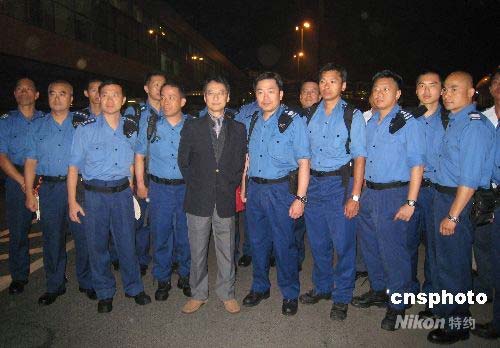 五月十五日凌晨,香港特區(qū)政府派出的二十人搜救隊伍,抵達四川地震災區(qū)協(xié)助搜救工作。搜救隊成員包括消防處特別救援隊十五名消防員及三名救護員,以及衛(wèi)生署一名醫(yī)生及護士。圖為香港特別行政區(qū)政府駐成都經濟貿易辦事處主任陸仿真(中)與搜救隊員合照。中新社發(fā) 中新社/政府新聞處 攝