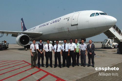 五月十五日,一架滿載臺(tái)灣同胞為四川地震災(zāi)區(qū)捐贈(zèng)的四十三噸救災(zāi)物資的飛機(jī)停在澳門國(guó)際機(jī)場(chǎng)整裝待發(fā)。澳門航空公司免費(fèi)加開(kāi)的這架空中巴士A300-600R貨機(jī)當(dāng)日中午從臺(tái)北桃園機(jī)場(chǎng)起飛,在澳門國(guó)際機(jī)場(chǎng)作暫短停留后,將飛抵成都雙流國(guó)際機(jī)場(chǎng)。中新社發(fā) 史利 攝