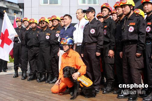 五月十六日上午,臺北市長郝龍斌在臺北市災(zāi)害應(yīng)變中心向救援隊授旗,加油打氣。由臺灣紅十字會組織派遣的救援隊一行二十二人和一只搜救犬五月十六日下午將乘包機(jī)直飛四川救災(zāi)。臺灣紅十字會組織派遣的這支救援隊隸屬于臺北市。中新社發(fā) 陳立宇 攝