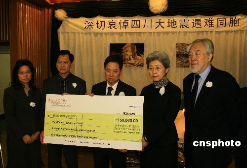 當(dāng)?shù)貢r間19日下午2時28分,旅英華人華僑、中資機構(gòu)和留學(xué)生代表在中國使館內(nèi),和中國外交官一起默哀三分鐘,沉痛悼念在四川大地震中遇難的同胞。圖為華人僑領(lǐng)向傅瑩大使(右二)轉(zhuǎn)交首批抗震救災(zāi)捐款15萬英鎊。