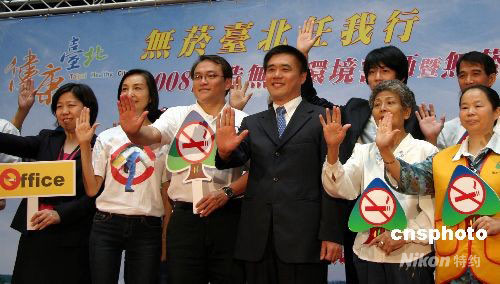 六月二日,近四百位臺北各界禁煙志工匯聚臺北市政大樓,舉行“二00八無煙臺北任我行——營造無煙環(huán)境誓師大會”。臺北市長郝龍斌(前右三)吁請市民遵守即將于2009年生效的“煙害防制法新法”。六月三日是臺灣一年一度的禁煙節(jié)。將于二00九年一月十一日起施行的“煙害防制法新法”規(guī)定:于禁煙場所吸煙者,最高罰款將自現(xiàn)行的三千元新臺幣提高為一萬元新臺幣。中新社發(fā) 許曉青 攝