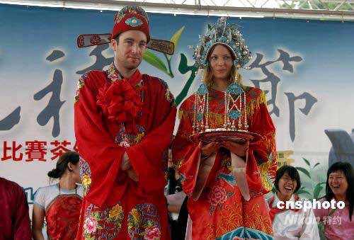 六月七日,正在臺灣師范大學(xué)進修漢語技能的十六名老外,應(yīng)邀體驗一年一度的臺灣“文山包種茶節(jié)”。由一對男女學(xué)生臨時湊成的“夫妻檔”,現(xiàn)場體驗傳統(tǒng)中式“茶婚禮”,“新娘”為扮演男方家長的其他幾位外籍學(xué)生奉茶,完成“文定”儀式。中新社發(fā) 許曉青 攝