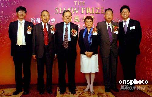 六月十日,二零零八年度“邵逸夫獎(jiǎng)”在香港舉行新聞發(fā)布會(huì),公布今屆得獎(jiǎng)人名單及獲頒獎(jiǎng)項(xiàng),而頒獎(jiǎng)典禮將于九月九日舉行。邵方逸華女士、馬臨教授(右二)、楊綱凱教授、譚尚渭教授及楊振寧教授(左一起)等“邵逸夫獎(jiǎng)”理事會(huì)成員與擔(dān)任司儀的陳志云(右一)在新聞發(fā)布會(huì)后合照。中新社發(fā) 鄧慶樂(lè) 攝