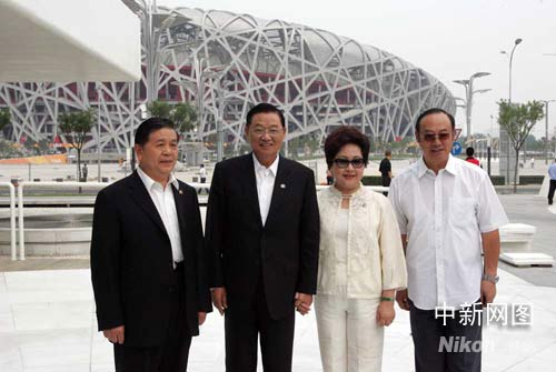 6月12日下午,海峽交流基金會(huì)董事長(zhǎng)江丙坤參觀了北京奧運(yùn)會(huì)場(chǎng)館,圖為江丙坤等人在“鳥(niǎo)巢”前留影。中新社記者 張宇 攝