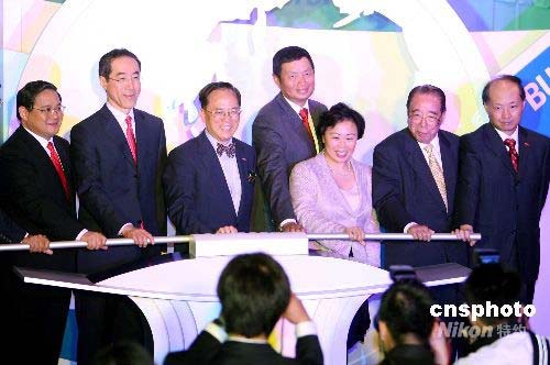 七月三日,為慶祝香港國際機場啟用十周年,機場管理局在港麗酒店舉行慶典及酒會,香港特區(qū)行政長官曾蔭權(quán)、政務(wù)司長唐英年、機場管理局主席張建東等嘉賓主持慶典儀式。中新社發(fā) 洪少葵 攝