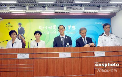 九月二日,香港特區(qū)政府就北京二零零八年殘奧馬術(shù)比賽項目的準(zhǔn)備工作舉行記者會,香港民政事務(wù)局局長曾德成、奧運馬術(shù)公司行政總裁林煥光、香港殘疾人奧委會暨傷殘人士體育協(xié)會主席馮馬潔嫻、運輸署助理署長(新界)羅鳳屏和警察公共關(guān)系科總警司吳家聲向媒體公布相關(guān)事宜。中新社發(fā) 鄧慶樂 攝