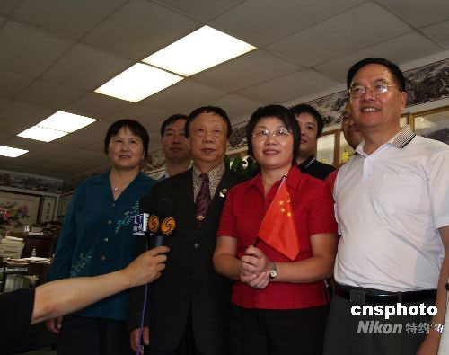當?shù)貢r間9月24日,中國神舟七號載人飛船發(fā)射圓滿成功,極大地鼓舞了海外華人的愛國熱情。美國南加州華人聯(lián)合總會會長程遠、亞裔聯(lián)盟主席江志成、美國浙江經(jīng)貿(mào)聯(lián)合會榮譽會長李社潮等僑領聚集在洛杉磯,熱烈慶祝祖國航天事業(yè)取得偉大成就。中新社發(fā) 盧威 攝