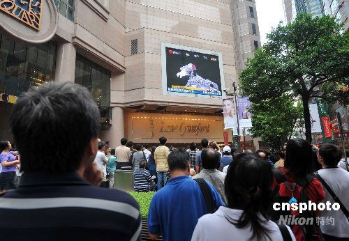 九月二十七日,中國(guó)“神舟七號(hào)”航天員翟志剛歷史性作漫步太空,成為中國(guó)航天事業(yè)的新里程碑。在香港銅鑼灣時(shí)代廣場(chǎng)的大型戶外電視屏幕下,眾多市民駐足觀看電視直播。圖為航天員翟志剛漫步太空期間并揮動(dòng)國(guó)旗,以及收集飛船外的太空實(shí)驗(yàn)樣本。中新社發(fā) 鄧慶樂 攝
