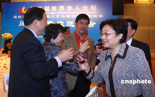 10月29日晚,第五屆世界華人論壇在北京閉幕。國(guó)務(wù)院僑辦主任李海峰出席歡送宴會(huì)并向參會(huì)代表們敬酒致意。中新社發(fā) 廖文靜 攝