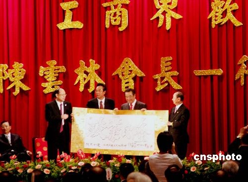 圖為陳云林代表海協(xié)會(huì)致贈(zèng)以撰寫“駿業(yè)日隆”四大字的書法作品,祝福臺(tái)灣工商界生意興隆。