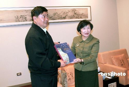 11月24日,國家文物局局長、中華文物交流協(xié)會會長單霽翔(左)率大陸多位文物界人士,參訪臺北故宮博物院,并與臺北故宮博物院院長周功鑫互贈禮物。中新社發(fā) 周兆軍 攝