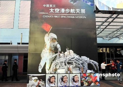 “中國首次太空漫步航天展”將于十二月六至十五日在香港科學館舉行。展覽將介紹中國載人航天工程,以及今年順利完成出艙任務(wù)的神舟七號宇宙飛船及航天員;主要展品則包括神舟七號宇宙飛船的返回艙、航天服、航天員出艙后所展示的國旗,以及近百幀珍貴的相關(guān)圖片。圖為巨幅宣傳海報在科技館門前展示。中新社發(fā) 譚達明 攝
