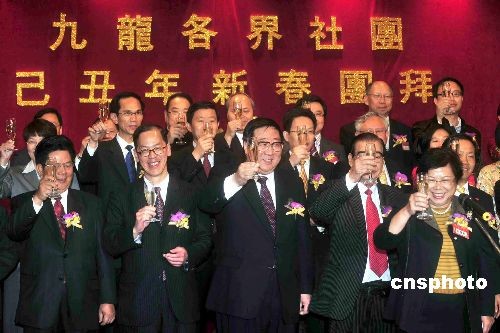 二月六日,九龍地區(qū)事務聯(lián)會聯(lián)席會議及九龍社團聯(lián)會等在香港一酒店舉行新春酒會,各界嘉賓濟濟一堂,場面熱鬧。中聯(lián)辦主任高祀仁(前中)及香港特區(qū)民政事務局局長曾德成(前左二)等帶領(lǐng)眾嘉賓祝酒。中新社發(fā) 譚達明 攝