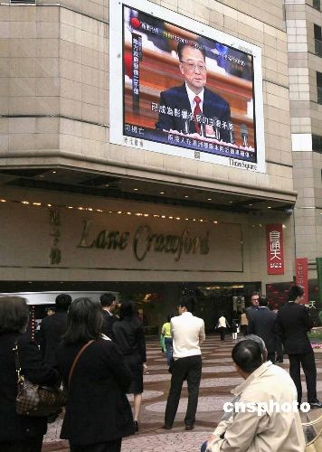 三月五日上午,香港市民在時(shí)代廣場通過大屏幕收看國務(wù)院總理溫家寶在十一屆全國人大二次會(huì)議上作的《政府工作報(bào)告》。中新社發(fā) 張勤 攝