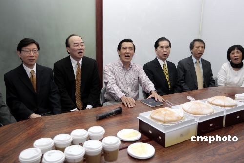 3月30日,臺灣地區(qū)領(lǐng)導(dǎo)人選舉當(dāng)選人馬英九(左二)在國民黨中央黨部大樓接見女師附小小學(xué)同學(xué),在會見室里一起唱起校歌并切蛋糕表示慶祝。中新社發(fā) 杜洋 攝