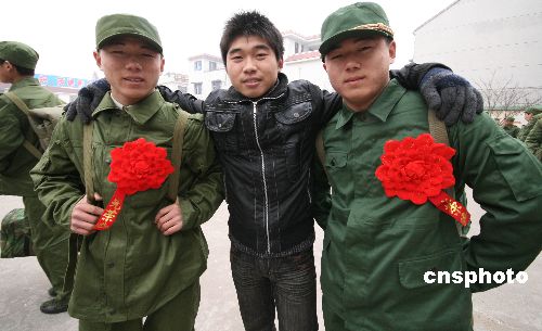 12月11日下午,家住安徽蒙城縣漆園辦事處城北村的雙胞胎兄弟鄭根林、鄭隨林同時(shí)參軍,起程開赴各自部隊(duì)開始多彩的軍營(yíng)生活。鄭家兄弟自幼羨慕軍營(yíng)生活,今年冬季征兵開始后,兄弟倆一起報(bào)名參加體檢和政審,并雙雙通過(guò),被解放軍某部和武警某部批準(zhǔn)入伍,雙胞胎兄弟同時(shí)參軍入伍在當(dāng)?shù)貍鳛榧言。中新社發(fā) 胡衛(wèi)國(guó) 攝