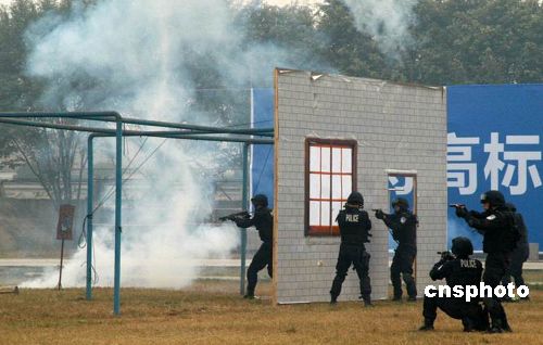 十二月二十八日,廣東佛山公安特警、武警舉行技戰(zhàn)演練,在反劫持人質(zhì)綜合演練中,佛山特警為了解救被“劫持”的5名國家重點項目科技人員,在反恐指揮部的指令下,地面攻擊組、車輛突擊組、垂降組、情報組、爆破組、談判組迅速到達指定位置待命,然后以迅雷不及掩耳之勢發(fā)起立體攻擊,瞬間將恐怖分子擊斃,安全解救人質(zhì)。中新社發(fā) 孫建駒 攝