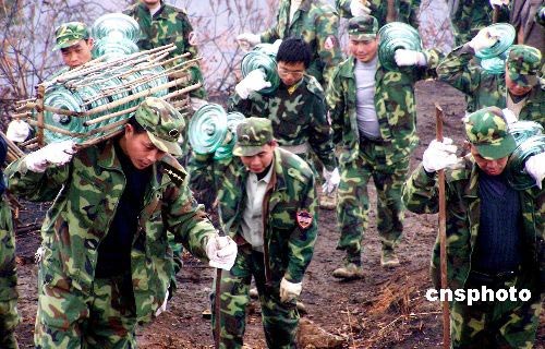2月19日,預(yù)備役戰(zhàn)士為賀州市海拔1000多米的電網(wǎng)搶修工地運(yùn)送“懸式玻璃絕緣子”。2月17日,廣西軍區(qū)組織部隊(duì)民兵預(yù)備役1100人奔赴賀州市,參加廣西電網(wǎng)遭受冰災(zāi)損失最嚴(yán)重、修復(fù)工程量最大的“萬(wàn)道線220千伏”電網(wǎng)搶修大決戰(zhàn)。戰(zhàn)士們開山路、頂風(fēng)雨、踏泥濘,采用肩扛背馱的方式,僅用3天時(shí)間就將300多噸的電網(wǎng)搶修物資全部安全運(yùn)送到海拔400--1000多米、長(zhǎng)30公里的高山工地上,為全面修復(fù)賀州電網(wǎng)贏得了時(shí)間。中新社發(fā) 喻湘泉 攝