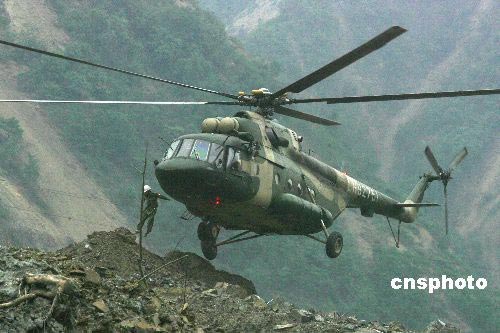 五月二十日是汶川大地震第九天,成都軍區(qū)陸航團(tuán)姜廣偉王牌直升機(jī)組上午十時(shí)成功以單輪強(qiáng)降北川重災(zāi)區(qū)“定時(shí)炸彈”——堰塞湖無(wú)名塌方小土堆上,緊急運(yùn)送水利地質(zhì)技術(shù)隊(duì)實(shí)地監(jiān)測(cè)水位上漲危情。一座大山的崩塌堵塞河道形成危險(xiǎn)的堰塞湖,如果潰堤將危及北川全縣和綿陽(yáng)災(zāi)區(qū)。中新社發(fā) 賈國(guó)榮 攝