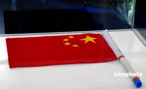 11月4日,在廣東珠海市舉行的“第七屆中國(guó)國(guó)際航空航天博覽會(huì)”上,航天員翟志剛在太空出艙漫游時(shí)揮舞的國(guó)旗和所戴的手套,首次與觀眾見面!吧裰邸逼咛(hào)飛船軌道艙(正樣備份品)以及"神舟"七號(hào)飛船返回艙模型也將展出。中新社發(fā) 楚天行 攝