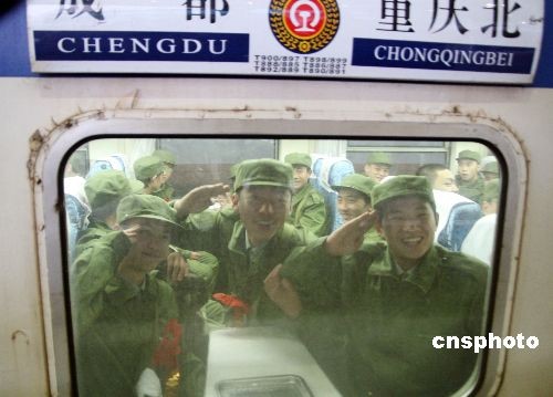 11月19日下午,重慶地區(qū)2008年冬季招兵征召的首批915名進藏新兵在重慶火車北站登上列車,前往成都受訓準備進藏服役。據稱,本次前往西藏服役的新兵8成以上達到高中以上文化程度,平均年齡為19歲,來自重慶大足、璧山、渝北等17個區(qū)縣。中新社發(fā) 郭晉嘉 攝