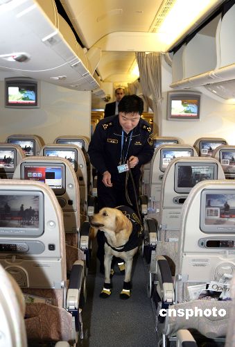 春節(jié)前夕,兩條名叫“維特”和“泰格”的拉布拉多緝毒犬出現在T3航站樓一架來自阿聯(lián)酋的飛機機艙內。這是中國緝毒犬在歷史上首次登機檢查。近年來北京空港口岸人體藏毒和行李夾層藏毒案件明顯增多。為了進一步增加緝毒手段的主動性,提高口岸查毒的準確率,北京海關緝私局決定訓練緝毒犬進行登機檢查。海關緝毒人員對付跨國販毒分子又多了一個殺手锏。中新社發(fā) 雷虹 攝