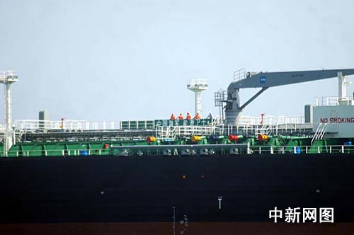 春節(jié)前夕,被護商船“凱達”號打出“中國海軍,能源衛(wèi)士!”標語向護航官兵致敬。中新社記者 孫自法 攝