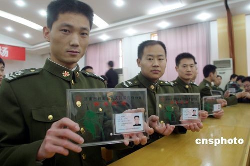 2009年2月26日,濟南警備區(qū)、濟南市公安局聯(lián)合舉行駐濟部隊現(xiàn)役軍人居民身份證首發(fā)儀式。自此,濟南市為駐濟部隊申領(lǐng)發(fā)放具名身份證工作正式啟動。此舉將對部隊人員辦理儲蓄、保險、買車、購房等涉及個人權(quán)益事物時帶來便捷。中新社發(fā) 龔輝 攝