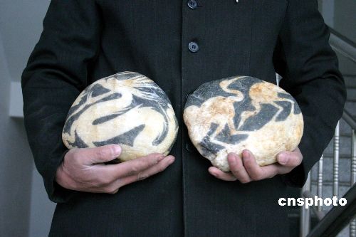 十一月十九日,河南伊川一奇石愛好者展示其收藏的兩塊有“龍”、“鶴”圖案的奇特石頭。據(jù)介紹,這位奇石愛好者最近在伊河灘撿到兩塊奇特的石頭,兩塊石頭均呈青灰色,大小相近,高約三十厘米、寬約二十厘米、厚約五厘米。一塊正面圖形酷似蛟龍,背面像北京奧運會舞動的“京”字會徽;另一塊正面圖案如同兩只嬉戲的仙鶴,背面則顯現(xiàn)出一副抽象的山水圖。兩塊奇石上的圖案惟妙惟肖、形象逼真。經(jīng)地質專家徐海龍鑒定,確認這兩塊奇石是天然的。中新社發(fā) 朱曉娟 攝