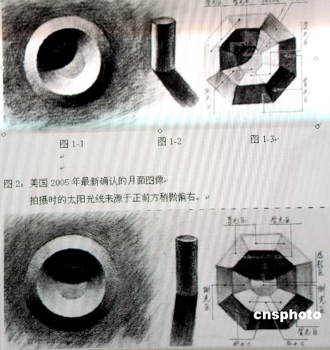 | 2007年12月6日,海南在京的一位畫家從光學(xué)角度找到中美兩“月亮”鮮明差別。中國(guó)嫦娥首幅月球圖像抄襲美國(guó)的傳言,在網(wǎng)上一度鬧得沸沸揚(yáng)揚(yáng),海南省畫家、超常創(chuàng)意專家于廣勝在北京,反復(fù)對(duì)照中美兩圖琢磨研究,從光學(xué)角度發(fā)現(xiàn)兩幅圖象有著“更加鮮明的差別”,6日早晨他發(fā)現(xiàn)兩幅圖像是在不同的光源下拍攝的,從另一側(cè)面有力證明了我國(guó)嫦娥傳回圖像的真實(shí)性。于廣勝說(shuō),這一證據(jù)是普通大眾不易發(fā)現(xiàn)的,但通過(guò)他所手繪的幾幅圖,即可讓普通大眾一目了然。同時(shí),凡是對(duì)光學(xué)有所研究或通曉繪畫用光、攝影和攝像用光的人們,自然明白其理。為了便于廣大讀者理解,他把地球上的環(huán)形山簡(jiǎn)化為內(nèi)凹外凸的圓臺(tái)(圖1-1、2-1),以顯現(xiàn)不同光線來(lái)源下的不同光影效果;由此,又進(jìn)一步簡(jiǎn)化為內(nèi)凹外凸八棱臺(tái)(圖1-3、2-3)并標(biāo)注了光線的來(lái)源和受光、測(cè)光、背光區(qū)域;同時(shí),又畫了一個(gè)圓柱體(1-2、2-2)以顯現(xiàn)不同光照角度下的不同投影方向。通過(guò)兩組手繪圖,中國(guó)與美國(guó)公布的兩張圖像在拍攝時(shí),太陽(yáng)光照射月球角度明顯不同,至少左右相差42度左右。中國(guó)拍攝時(shí)的太陽(yáng)光線來(lái)源于左前方,而美國(guó)拍攝時(shí)的太陽(yáng)光線來(lái)源于正前方稍微偏右。于廣勝說(shuō),稍有電腦平面制作、攝影和攝像后期制作知識(shí)的人們都明白,圖片與圖片的任意組合拼接是輕而易舉的,但要想把圖片中各個(gè)圖像所有細(xì)節(jié)的光影全部改變是不可能的,“由此可見(jiàn),我國(guó)嫦娥傳回的圖像其真實(shí)性是不容質(zhì)疑了!毕嚓P(guān)鏈接:12月2日,中國(guó)探月工程首席科學(xué)家、中國(guó)科學(xué)院院士歐陽(yáng)自遠(yuǎn)做客上海“文匯講堂”,對(duì)關(guān)于“嫦娥首幅月球圖像抄襲美國(guó)”的傳言作出澄清:“嫦娥傳回的圖像確實(shí)是真實(shí)的,是經(jīng)過(guò)非常復(fù)雜的拍攝、傳輸、接收、處理過(guò)程后得到的,并且與美國(guó)所拍的圖像有細(xì)微差別”。我國(guó)嫦娥一號(hào)衛(wèi)星所攝的月面圖像上,某個(gè)地方有兩個(gè)小坑,而美國(guó)2005年最新確認(rèn)的月面圖像上,同樣的地方只有一個(gè)小坑。中新社發(fā) 善平 攝