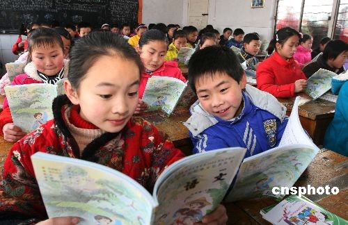 2月20日,六安市金安區(qū)人民路小學(xué)五年級學(xué)生在閱讀新課本。當(dāng)日,在經(jīng)受50年不遇暴雪災(zāi)害的大別山老區(qū)安徽省六安市,各中小學(xué)校的學(xué)生們領(lǐng)到新課本,如期開學(xué)上課。雪災(zāi)發(fā)生后,當(dāng)?shù)攸h委、政府采取多種措積極施維修雪毀校舍,嚴格執(zhí)行收費政策,免去城區(qū)學(xué)生的學(xué)雜費和部分下崗特困戶子女的課本作業(yè)費,農(nóng)村學(xué)生費用全免,保障災(zāi)后教學(xué)工作正常進行。中新社發(fā) 陳超平 攝