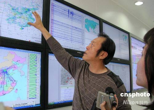 五月十三日,中國地震臺(tái)網(wǎng)中心地震臺(tái)網(wǎng)部副主任田豐向媒體介紹中國地震臺(tái)網(wǎng)中心在汶川大地震后對(duì)災(zāi)區(qū)余震進(jìn)行監(jiān)測(cè)的情況。他說,余震監(jiān)測(cè)將為災(zāi)區(qū)地震發(fā)展趨勢(shì)研判和一線開展抗震救災(zāi)工作提供監(jiān)測(cè)數(shù)據(jù)。中新社發(fā) 孫自法 攝