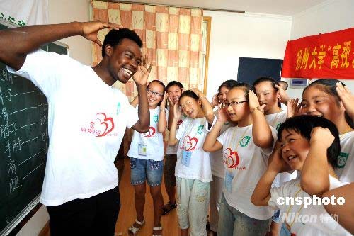 7月10日,揚州大學(xué)藝術(shù)學(xué)院的外教羅伯特,正在給地震災(zāi)區(qū)孩子進(jìn)行暑期夏令營授課。當(dāng)日,揚州大學(xué)藝術(shù)學(xué)院、體育學(xué)院、教育科學(xué)學(xué)院以及外國語學(xué)院的20余名師生,為來自四川地震災(zāi)區(qū)的67名學(xué)生舉辦“真情傳遞、愛心永恒”素質(zhì)拓展夏令營活動,幫助他們開闊視野、豐富知識、拓展素質(zhì)。中新社發(fā) 顧亮亮 攝