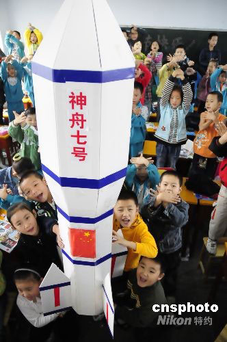 9月25日,河南省南陽(yáng)市第四小學(xué)三(1)班的學(xué)生們制作了一只“神舟七號(hào)”,預(yù)祝我國(guó)的“神七”發(fā)射計(jì)劃圓滿成功。中新社發(fā) 付海厚 攝