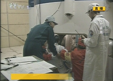 25日18時(shí)25分許,神舟七號(hào)三名航天員陸續(xù)進(jìn)艙。第一名進(jìn)艙的是景海鵬,第二名進(jìn)艙的是劉伯明,最后,指令長(zhǎng)翟志剛也開始進(jìn)入。