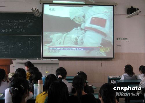 2008年9月27日下午,安徽師范大學(xué)學(xué)生在教室集體觀看宇航員太空行走直播。北京時(shí)間9月27日下午四點(diǎn)五十九分,神舟七號(hào)航天員翟志剛成功出艙,實(shí)現(xiàn)中國(guó)歷史上第一次太空行走。中新社發(fā) 劉淮宇 攝
