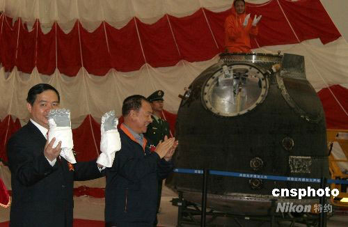 10月1日上午,神舟七號(hào)載人飛船返回艙在其誕生地——中國(guó)航天科技集團(tuán)公司所屬中國(guó)空間技術(shù)研究院舉行開(kāi)艙暨搭載物交接儀式,伴隨三位中國(guó)航天員太空飛行六十八小時(shí)二十七分鐘的一批特殊“乘客”一一精彩亮相,隨后各歸其主。圖為中國(guó)載人航天工程航天員系統(tǒng)總指揮兼總設(shè)計(jì)師、中國(guó)航天員科研訓(xùn)練中心主任陳善廣展示將由該中心珍藏、首次成功使用過(guò)的“飛天”艙外航天服手套。中新社發(fā) 孫自法 攝