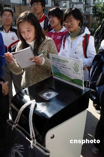 10月31日晚,由某環(huán)保企業(yè)率先發(fā)起的環(huán)!熬G箱子”進(jìn)校園活動在中國傳媒大學(xué)、清華大學(xué)正式展開,此次活動的目的在于喚起全民族的環(huán)保意識,讓每一位公民都為環(huán)保事業(yè)做力所能及的事情。中新社發(fā) 任海霞 攝