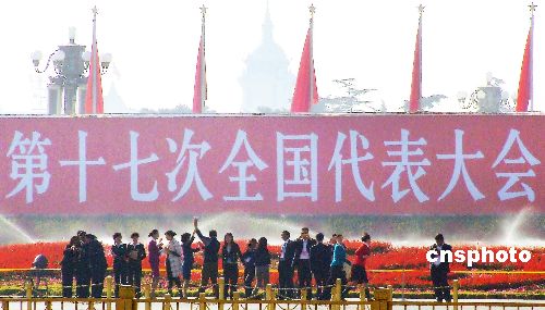 10月21日,中國(guó)共產(chǎn)黨第十七次全國(guó)代表大會(huì)在北京人民大會(huì)堂勝利閉幕。一些大會(huì)工作人員在天安門(mén)廣場(chǎng)留影。中新社發(fā) 鄭雄增 攝