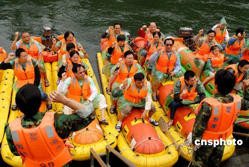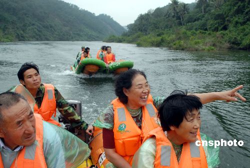 12月30日,一群參加海南萬(wàn)泉河峽谷漂流的游客在出發(fā)前和工作人員一起宣誓做環(huán)保衛(wèi)士。2008新年到來(lái)之際,海南峽谷漂流生意愈加紅火,去五指山峽谷和萬(wàn)泉河峽谷玩漂流的游客成倍增多。冬季仍如春夏的海南島成為不少人理想的游玩去處。中新社發(fā) 善平 攝