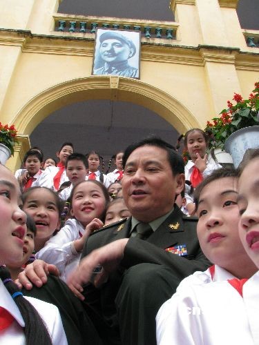 3月19日,中央電視臺“心連心”藝術(shù)團到廣西龍州縣革命老區(qū)慰問演出,圖為鄧小平的扮演者盧奇在紅八軍軍部舊址與當?shù)匦W生親切交談。中新社發(fā) 夏曉弘 攝