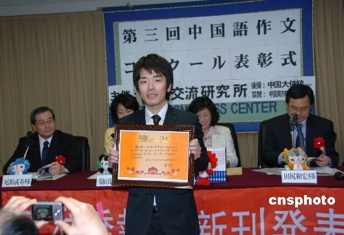 東京外國語大學(xué)三年級學(xué)生新保隆之從留學(xué)中國一年的體驗談北京奧運的作文受到高度評價,獲得中國駐日大使崔天凱簽名的最優(yōu)秀獎。中新社發(fā) 段躍中 攝