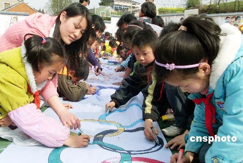 4月2日,江蘇大學(xué)人文學(xué)院50多名大學(xué)生走進鎮(zhèn)江市七里甸中心小學(xué),與該校學(xué)生一起開展“大小學(xué)子共繪奧運畫卷”活動,學(xué)子們在百米長卷上共同繪制了奧運福娃、五環(huán)標(biāo)志和各類運動項目等圖案,表達他們對北京奧運會的期盼和祝愿。作者: 石玉成
