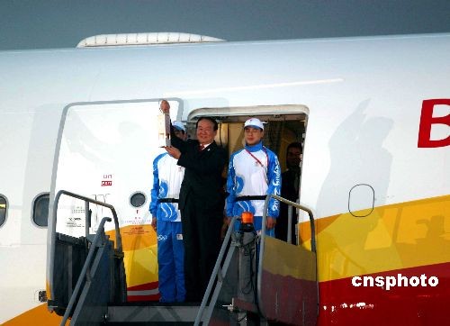4月5日晚7時(shí)25分,載有北京奧運(yùn)祥云圣火的“奧運(yùn)圣火號(hào)”飛抵英國(guó)首都倫敦。倫敦人對(duì)圣火的到來(lái)極為重視,奧運(yùn)事務(wù)大臣等重要官員悉數(shù)抵達(dá)機(jī)場(chǎng)迎接。圖為北京奧組委執(zhí)行副主席蔣效愚(中)手提圣火燈走下飛機(jī)。 中新社發(fā) 沈晨 攝
