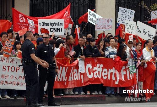 當?shù)貢r間4月19日,洛杉磯爆發(fā)十幾年來最大規(guī)模的華人華僑抗議示威活動。數(shù)千名華人華僑和留學生在CNN洛杉磯分部門前參加和平示威,要求CNN向公開鄭重道歉,并開除卡弗蒂。示威活動自始至終秩序井然,現(xiàn)場執(zhí)勤警察一臉輕松。中新社發(fā) 張煒 攝