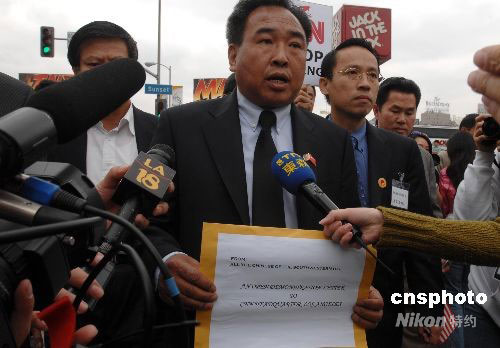 當(dāng)?shù)貢r(shí)間4月19日上午,示威活動(dòng)現(xiàn)場(chǎng)總指揮陳軍(中)準(zhǔn)備向CNN遞交抗議信,但最終CNN方面無(wú)人出面接受抗議書(shū)。洛杉磯當(dāng)天爆發(fā)十幾年來(lái)最大規(guī)模的華人華僑抗議示威活動(dòng)。數(shù)千名華人華僑和留學(xué)生在CNN洛杉磯分部門(mén)前參加和平示威,要求CNN向公開(kāi)鄭重道歉,并開(kāi)除卡弗蒂。中新社發(fā) 張煒 攝