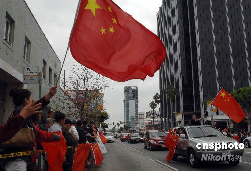 當(dāng)?shù)貢r(shí)間4月19日,洛杉磯爆發(fā)十幾年來(lái)最大規(guī)模的華人華僑抗議示威活動(dòng)。數(shù)千名華人華僑和留學(xué)生在CNN洛杉磯分部門(mén)前參加和平示威,要求CNN向公開(kāi)鄭重道歉,并開(kāi)除卡弗蒂。圖為抗議者駕車(chē)揮舞五星紅旗。中新社發(fā) 張煒 攝